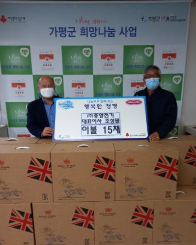 (주)중앙전기는 11월 22일 청평면 행정복지센터에 지역 내 저소득층 독거노인을 위해 양모이불 15채를 기탁하였다.