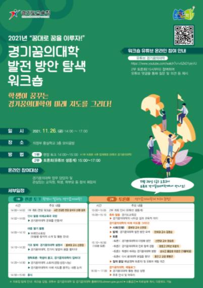 2부 온라인 토론은 인하대 김영순 교수가 발표하는 경기꿈의대학 발전 방안을 주제로 학생, 교사, 교수 등 참석자들이 학생 진로 탐색을 위한 체험 기회 확대, 다양화를 위한 지역 활용 방안 등을 논의한다.
