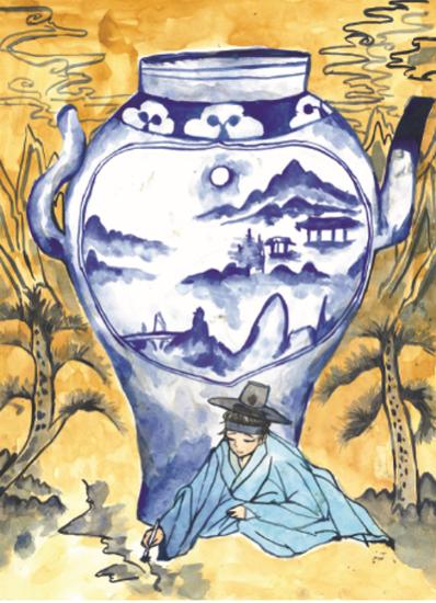그림 부문 대상은 오채린(서일초 6) 학생의 ‘그림을 그리는 선비’가 차지했다. 백자청화 산수문 수주(水注)를 그린 뒤 앞에는 그림을 그리고 있는 선비를, 뒤에는 옛날 그림 느낌의 구름, 산, 소나무를 그려 창작·제작 의도를 뚜렷하게 표현했다.
