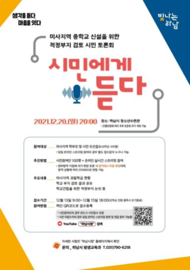 [한국뉴스타임=편집국] 하남시는 미사 중학군 중학교 신설 관련 시민 의견 수렴 및 해법 마련을 위해 20일 저녁 8시 ‘시민에게 듣다’ 토론회를 연다고 10일 밝혔다.