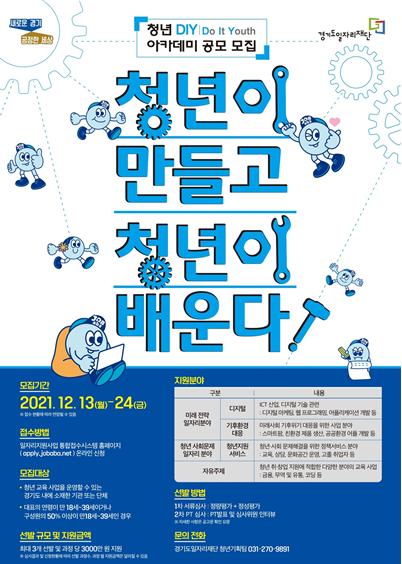 [한국뉴스타임=편집국] 경기도일자리재단이 청년이 기획하는 청년 대상 교육과정인 ‘청년 DIY(Do It Youth)’ 아카데미 공모전 참여 기관을 13일부터 오는 24일까지 모집한다.