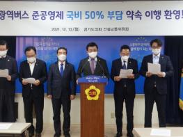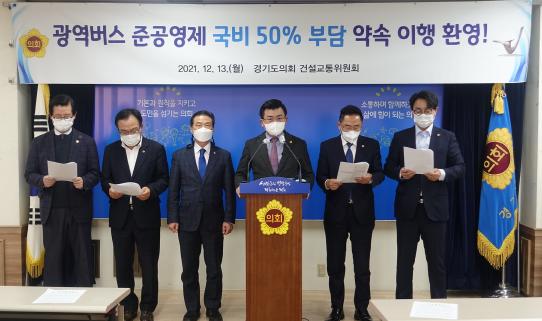 [한국뉴스타임=편집국] 경기도의회 건설교통위원회(김명원 위원장, 더불어민주당 부천6)는 13일 경기도의회 3층 브리핑 룸에서 2019년 5월 경기도와 국토교통부가 광역버스를 국가사무로 전환하면서 국가가 준공영제 비용의 50%를 부담하기로 합의한 사항의 이행을 환영하는 기자회견을 가졌다.