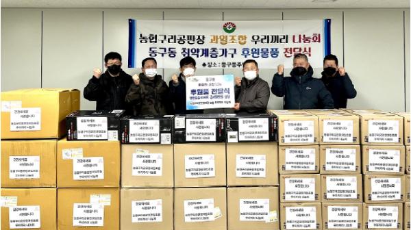 [한국뉴스타임=편집국] 구리시 동구동 행정복지센터는 13일 구리농수산물도매시장 농협구리공판장과일조합과 ‘건강한 겨울나기 맞춤형 후원품 전달식’을 가졌다.