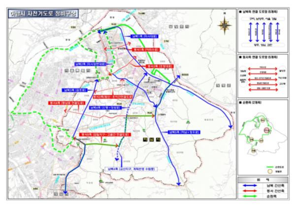 하남시 자전거 이용 활성화 계획은 간선도로축 자전거도로를 연결할 수 있도록 남북 5축, 동서 5축, 순환 2개축을 설정했다.