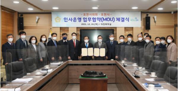 [한국뉴스타임=편집국] 포천시의회는 16일 포천시의회 2층 의원회의실에서 지방자치법 시행에 앞서 지방의회 인사권 독립의 조기정착과 효율적인 운영을 위해 포천시와 업무협약을 체결했다.