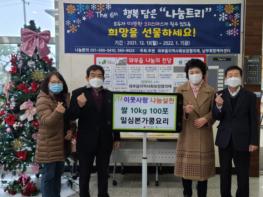 [한국뉴스타임=편집국] 남양주시 와부읍 팔당리에 위치한 ‘일심본가콩요리’, ‘브레드쏭’, ‘레미쏠트’에서 지난 16일 지역 내 취약계층 지원을 위해 ‘행복 담은 나눔 트리’에 쌀 100포(10kg), 라면 50박스, 롤 화장지 30팩 등 총 510만원 상당의 후원물품을 기탁했다.