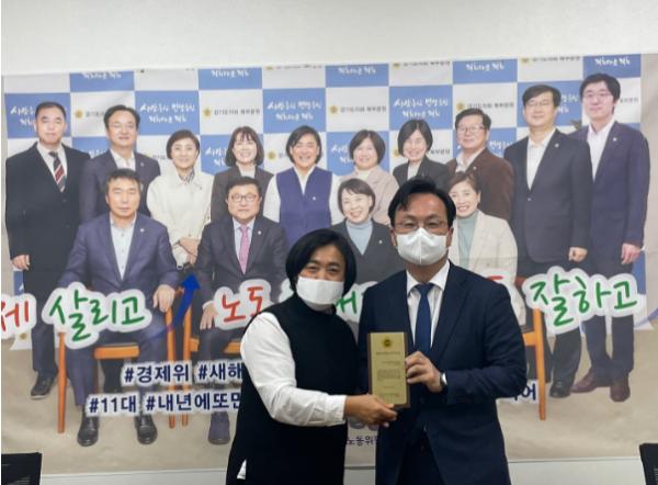 [한국뉴스타임=편집국] 경기도의회 경제노동위원회 이동현 의원(더민주, 시흥4)이 12월 16일 상임위원회 회의실에서 경제노동위원회가 주관하고, 경제노동위원장이 수여하는 2021년 행정사무감사 우수의원에 선정되어 공로패를 받았다.