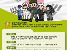 입영지원금 신청·접수는 2022년 1월 3일부터 가능하며 입영 전일까지 거주지 읍·면·동사무소에 신분증과 입영(소집)통지서를 가지고 신청하면 되고, 시에서는 지역화폐(남양주사랑상품권)로 입영지원금을 지급할 예정이다.