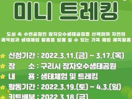 ‘미니트레킹’ 프로그램은 도심 속 수변공원인 장자호수생태공원을 산책하며 자연의 쾌적함을 느끼고, 또한 기존의 구리 둘레길과 연계된 힐링 산책로에서 가족과 함께 미니 트레킹 및 생태체험관 체험활동을 할 수 있는 프로그램이다.