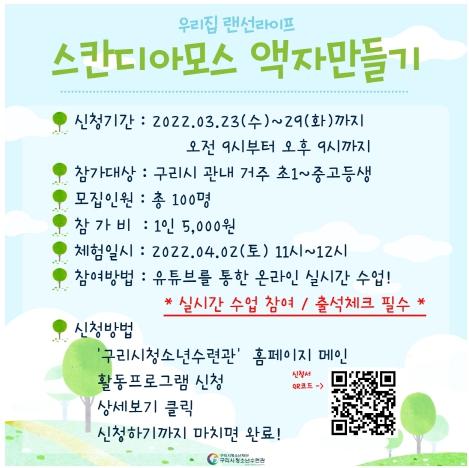 [한국뉴스타임=편집국] 구리시청소년재단 구리시청소년수련관은 4월 2일, 비대면 프로그램 “우리집 랜선라이프 ? 스칸디아모스 액자만들기” 를 운영한다.