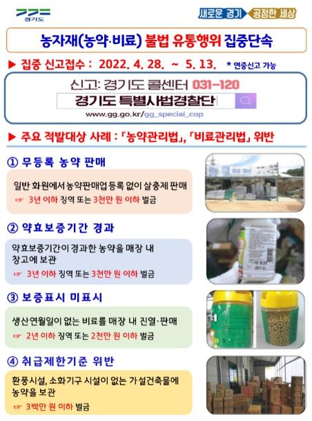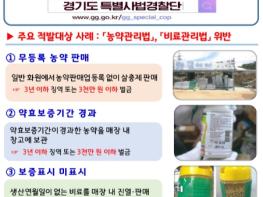 [한국뉴스타임=편집국] 경기도 특별사법경찰단은 농자재 안전성 확보와 건전한 유통 질서 확립을 위해 4월 28일부터 5월 13일까지 농약· 비료 등 농자재 관련 불법 유통행위를 집중 수사한다.