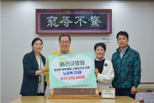 [KNT한국뉴스타임] 남양주시 별내동에 위치한 베리굿병원(원장 서면)에서 21일 남양주시 온라인 취약계층을 위한 노트북 25대(2천만원 상당)를 북부희망케어센터에 기부했다.