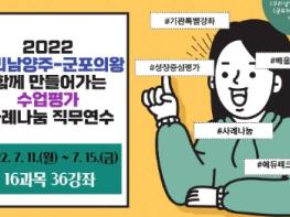 [한국뉴스타임=편집국] 경기도구리남양주교육지원청은 경기도군포의왕교육지원청과 연합하여 구리남양주와 군포의왕 지역의 희망 교사 대상으로 2022년 7월 11일(월)부터 7월 15일(금)까지 5일간 ‘2022 함께 만들어가는 수업평가 사례나눔 직무연수(16과목 36강좌)’를 실시한다.