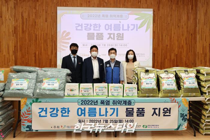 이번 사업은 여름을 맞아 폭염에 취약할 수 있는 취약계층 어르신 105명에게 인견쿨패트, 미숫가루, 백미, 손소독제, 코로나자가진단키트 등으로 구성된 키트를 지원하는 사업이다.