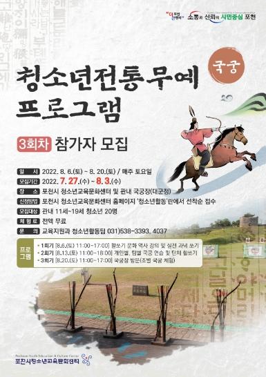 [한국뉴스타임=편집국] 포천시 청소년교육문화센터는 오는 27일부터 다음달 3일까지 청소년 전통무예(국궁) ‘포천화랑’ 프로그램 3회차 참가자를 모집한다.
