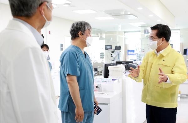 [한국뉴스타임=편집국] 김동연 경기도지사가 1일 코로나19 재유행에 대응하기 위해 성남시의료원 감염병전담병상과 수정구보건소 선별진료소를 찾아 현장을 점검하고 의료진과 직원들을 격려했다.