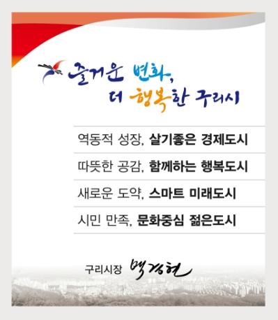 또한, ▲창조적인 문화와 촘촘한 사회안전망 ▲따뜻한 배려가 숨 쉬는 풍요롭고 살맛 나는 도시 ▲더 큰 행복을 꿈꾸는 구리시를 건설하겠다는 의지도 담은 표현이다.
