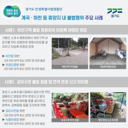 김민경 경기도 특별사법경찰단장은 “하천·계곡 등 휴양지 내 매년 상습적으로 발생하는 불법행위가 다시는 되풀이되지 않도록 무관용 원칙으로 지속적 관리를 해나갈 것”이라고 말했다.