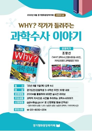 경기도는 ‘경기평화광장 북카페 8월 문화의 날 프로그램’으로 오는 8월 11일 오후 4시부터 'WHY? 작가가 들려주는 과학수사 이야기'를 개최한다고 3일 밝혔다.
