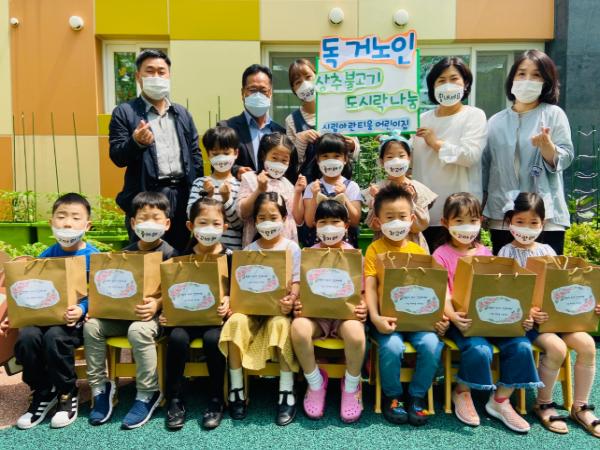 이날 어린이집 아이들이 고사리 같은 손으로 텃밭을 가꾸고 수확한 상추를 불고기와 곁들여 정성스럽게 만든 도시락을 어르신들에게 전달했다.