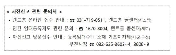 신고자는 자진신고서 등 신청 구비 서류를 준비하여 부천시청 8층 공동주택과에 방문하거나, 국토교통부의 등록민간임대주택 인터넷 민원 창구인 렌트홈 홈페이지에 접속하여 신고하면 된다.