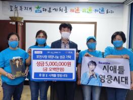 [한국뉴스타임=편집국] 가수 임영웅의 미국 내 팬클럽 ‘시애틀 영웅시대’는 지난 16일 성금 500만 원을 경기사회복지공동모금회를 통해 포천시에 기탁했다.