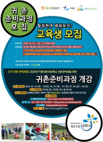 가평군 내 예비사회적기업인 협동조합 공감21 부설 가평귀촌귀농학교(교장 박천행)는 6월 18일부터 8일간 진행되는 귀촌 준비과정(현장중심 귀촌준비과정) 교육 참여자를 모집한다.