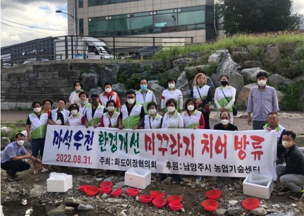 [한국뉴스타임=편집국] 남양주시 화도읍 이장협의회는 지난달 31일 남양주시 농업기술센터의 후원으로 화도읍 마석우천에 미꾸라지 치어 1만 마리를 방류하는 행사를 가졌다.