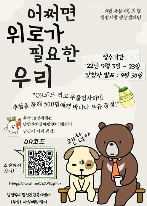 [한국뉴스타임=편집국] 남양주시와 남양주시자살예방센터는 9월 10일 ‘세계 자살예방의 날’을 맞아 오는 5일부터 23일까지 3주간 온라인 자살예방 캠페인 ‘어쩌면 위로가 필요한 우리’를 진행한다.