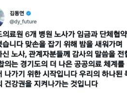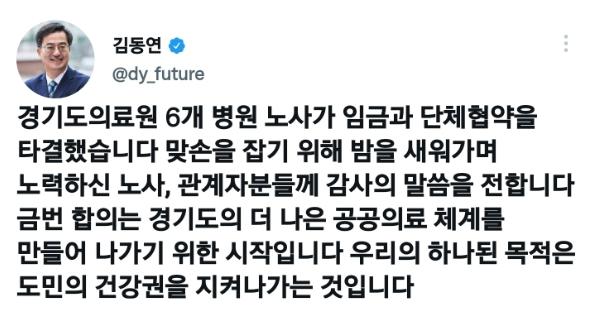 김동연 경기도지사는 1일 자신의 사회관계망서비스(SNS)를 통해 “맞손을 잡기 위해 밤을 새워가며 노력한 노사, 관계자분들에게 감사의 말씀을 전한다”며 “이번 합의는 경기도의 더 나은 공공의료 체계를 만들기 위한 시작이다. 우리의 하나 된 목적은 도민의 건강권을 지켜나가는 것”이라고 합의 소식을 전했다.