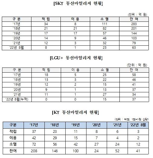 실제로 박완주 의원실이 통신3사로부터 제출받은 자료에 따르면 지난 5년간 소비자가 사용하지 못하고 소멸된 통신 3사 마일리지는 SKT 351억, KT 117억, LGU%2B 233억으로 총 701억에 달했으며 잔여 마일리지도 141억 원으로 확인됐다.