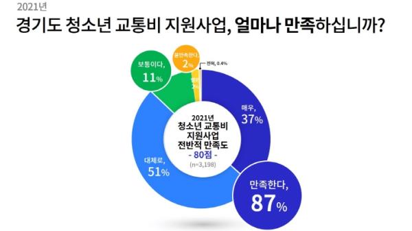 경기도는 지난 8월 2일부터 15일까지 ‘2021년 경기도 청소년 교통비 지원사업’ 이용자 3천198명을 대상으로 만족도 조사를 실시한 결과 이용자 87%가 경기도 청소년 교통비 지원사업에 대해 전반적으로 ‘만족한다(매우 만족 37%, 대체로 만족 51%)’고 응답했다고 25일 밝혔다. ‘보통이다’는 11%, ‘만족하지 않는다’는 응답은 2%에 그쳤다.