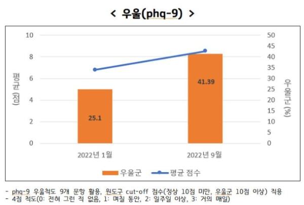 경기도와 서울대학교 보건대학원 유명순 교수 연구팀은 지난 9월 초 경기도 성인 남녀 1천 명을 대상으로 ‘코로나19에 대한 경기도민 인식변화 조사’를 한 결과 자가우울척도 기준 10점 이상(우울군)의 비율이 41.9%로 관련 조사 중 가장 높게 나왔다고 28일 밝혔다.