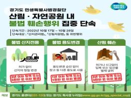 [한국뉴스타임=편집국] 경기도 민생특별사법경찰단은 오는 10월 17일부터 28일까지 산림 및 자연공원 내 불법 훼손 행위를 집중 단속한다.