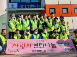 [한국뉴스타임=편집국] 구리시는 8일 강원행복나눔 봉사단 후원으로 교문1동 거주 독거어르신 7가구에 연탄 각 300장씩 총 2,100장을 직접 배달해 드리는‘따뜻한 연탄 나눔’봉사활동을 펼쳤다.