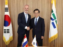 김동연 지사는 11일 집무실에서 폴 베르하겐(Paul Verhagen) 에이에스엠 인터내셔널(ASMI) 재무총괄이사(CFO)와 면담을 진행하고, 도내 투자 확대를 요청했다. 또한 외국인투자 증진과 활성화를 위한 제도에 대해 적극적인 지원 의지를 표명했다. 에이에스엠 인터내셔널(ASMI)은 반도체 증착장비 제조 부문 세계 10위권인 네덜란드의 대표적 글로벌기업이다.