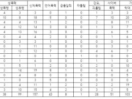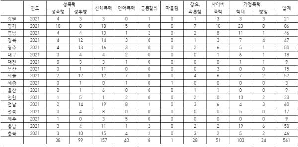 유형별로는 △신체폭력 27.98%(157건) △가정폭력(학대) 18.4%(103건) △성추행 17.6%(99건)이 가장 높은 비율을 차지했고, △사이버폭력 9.1%(51건) △언어폭력 7.7%(43건) △성폭행 6.8%(38건) △가정폭력(방임) 6.1%(34건) △강요, 괴롭힘 4.99%(28건) △금품갈취 1.4%(8건) △따돌림 0.2%(1건) 순이었다.