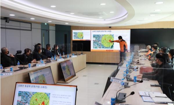 이날 참석자들은 화재현장 소방 차량 배치 기본모형을 활용해 대형화재 발생 시 출동대별 임무 명확화 방안, 소방용수(소화전, 자연 수리 등) 확보 및 활용 방안 등에 대해 교육 및 토의를 진행했다.