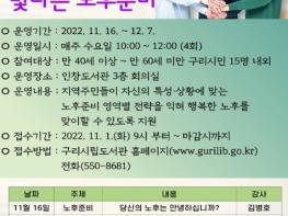 [한국뉴스타임=편집국] 구리시 인창도서관은 국민연금공단과 협력하여 11월 16일부터 12월 7일까지 『인창도서관에서 시작하는 빛나는 노후 준비』강좌를 운영한다.