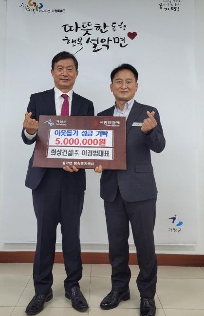 설악면이 고향인 이경범 대표는 서울에서 희상건설(주)을 운영하며 21년 산업포장을 수상한 데 이어 22년에는 공정거래위원회에서 정한 하도급 거래 모범업체로 선정된 바 있다. 또한 건전한 기업운영을 바탕으로 사회공헌에도 힘쓰기 위해 8년째 희상건설(주)이 위치한 주변 지역 독거노인 가구를 찾아 도배 및 장판 교체, 사랑의 연탄 나눔, 성금품 기탁 등 다양한 봉사활동을 펼치고 있으며, 21년도에도 설악면행정복지센터에 불우이웃돕기 성금 1,000만원을 기탁했다.