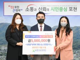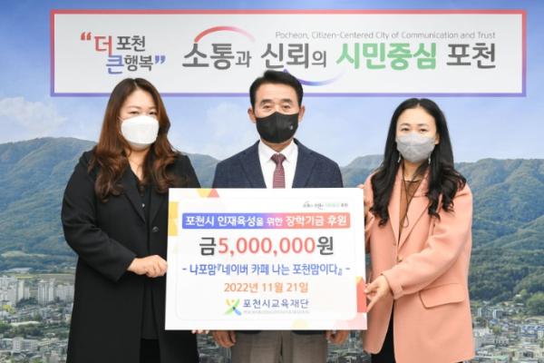 (재)포천시교육재단은 지난 21일 승강기 제조 전문업체 ㈜우주공업사와 네이버카페 ‘나는포천맘이다’에서 각각 5백만 원을 기탁했다고 밝혔다.