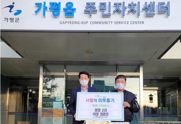 [한국뉴스타임=편집국] 가평군 가평읍 마장2리 이장 최중호 씨는 11월 18일 오후 가평읍행정복지센터 맞춤형복지팀에 방문하여 관내 어려운 이웃들을 위해 써달라며 백미 150KG을 전달했다.
