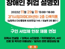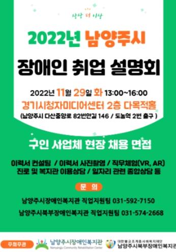 [한국뉴스타임=편집국] 남양주시장애인복지관과 남양주시북부장애인복지관은 오는 29일 남양주시 다산동에 있는 경기시청자미디어센터 2층 다목적홀에서 ‘2022년 남양주시 장애인 취업설명회’를 개최한다.