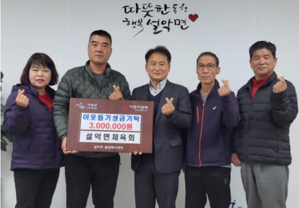 [한국뉴스타임=편집국] 가평군 설악면 체육회는 29일 설악면 행정복지센터를 방문하여, 이웃돕기 성금으로 300만원을 기탁했다.