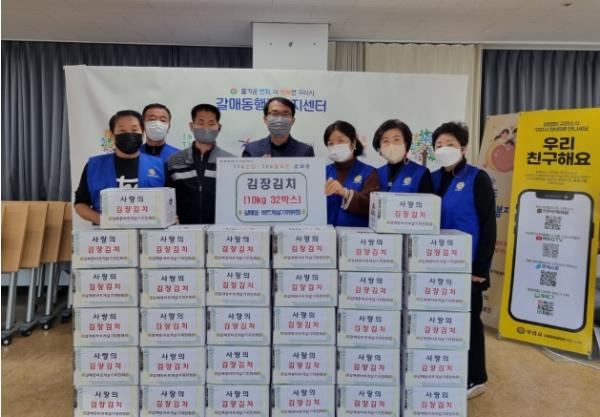 [한국뉴스타임=편집국] 구리시 갈매동 행정복지센터에서는 6일 갈매동바르게살기위원회(회장 박용미) 회원 6명과 조영훈 갈매동장이 참석한 가운데 추운 겨울을 맞은 어르신들을 위한 김장김치(32박스, 120만원 상당) 전달식을 가졌다.