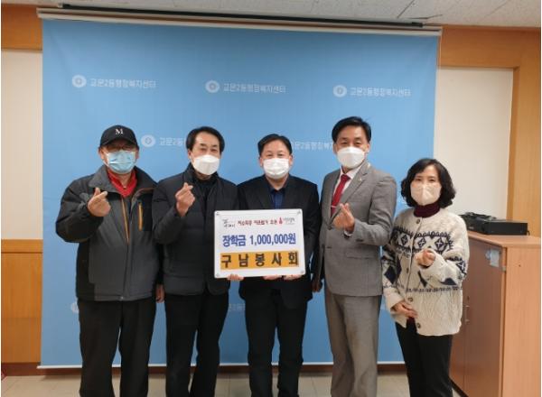 [한국뉴스타임=편집국] 구리시 교문2동행정복지센터는 6일 구남봉사회(회장 유오철)로부터 저소득층 청소년을 위한 장학금 100만원을 전달받았다.