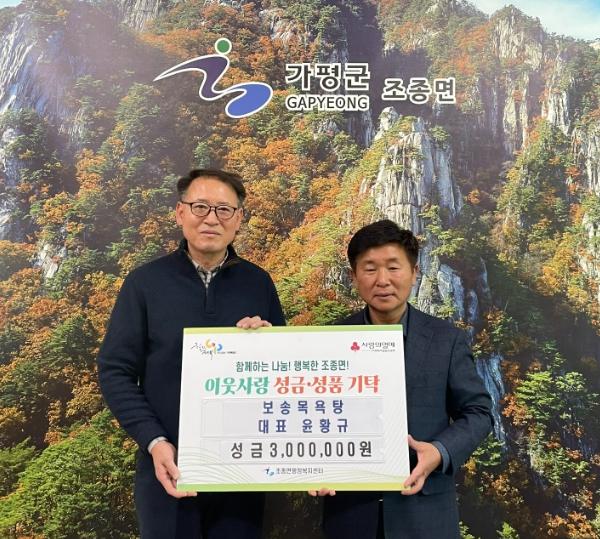 [한국뉴스타임=편집국] 보송목욕탕·보송볼링장 윤황규 대표는 지난 5일 조종면행정복지센터에 방문하여 성금 300만원을 기탁했다.