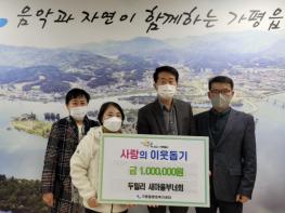 [한국뉴스타임=편집국] 가평읍 두밀리 새마을부녀회에서는 2022년 12월 12일 오전 가평읍행정복지센터 맞춤형복지팀에 마을의 주민과 펜션 등에서 함께 3년여 간 모은 공병을 재활용 업체에 판매하여 모은 기금 100만원을 사랑의 이웃돕기 성금으로 기탁했다.