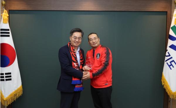 [한국뉴스타임=편집국] 붉은악마와 2022 카타르월드컵 대한민국 대표팀의 시민응원전을 공동주관한 김동연 경기도지사가 붉은악마 경기지부로부터 감사패를 받았다.