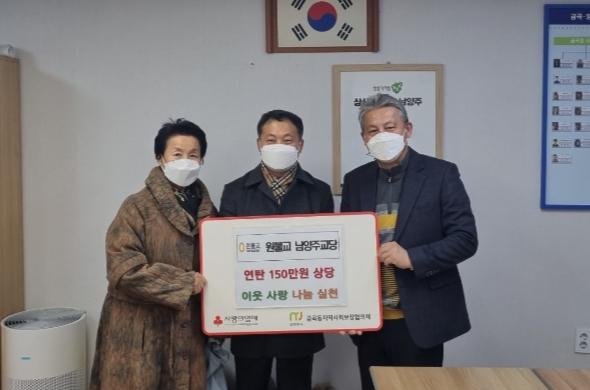 [한국뉴스타임=편집국] 남양주시 금곡양정행정복지센터는 14일 원불교 남양주교당(회장 이수재)이 관내 저소득 가구를 위해 연탄 지원금 150만 원을 기부했다고 밝혔다.
